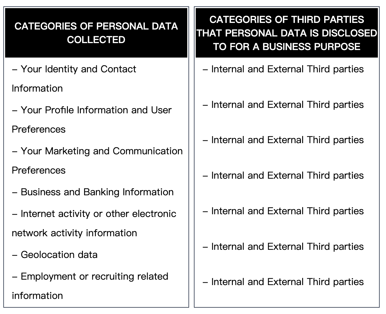CATEGORIES OF PERSONAL DATA COLLECTED